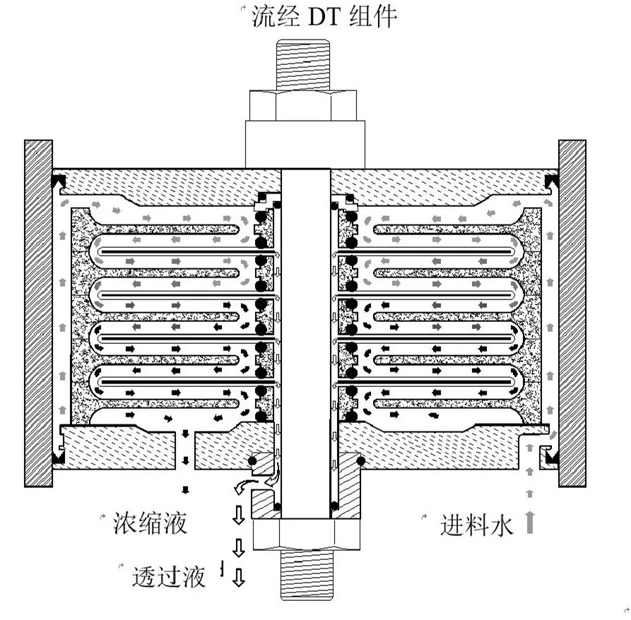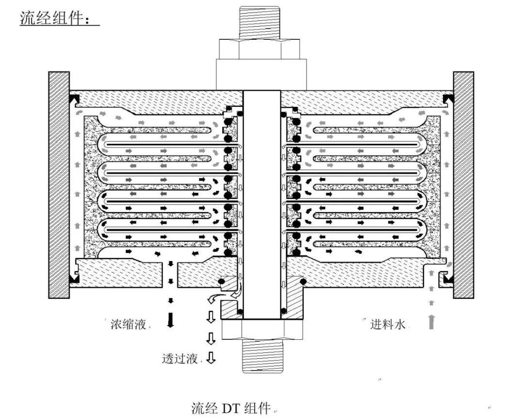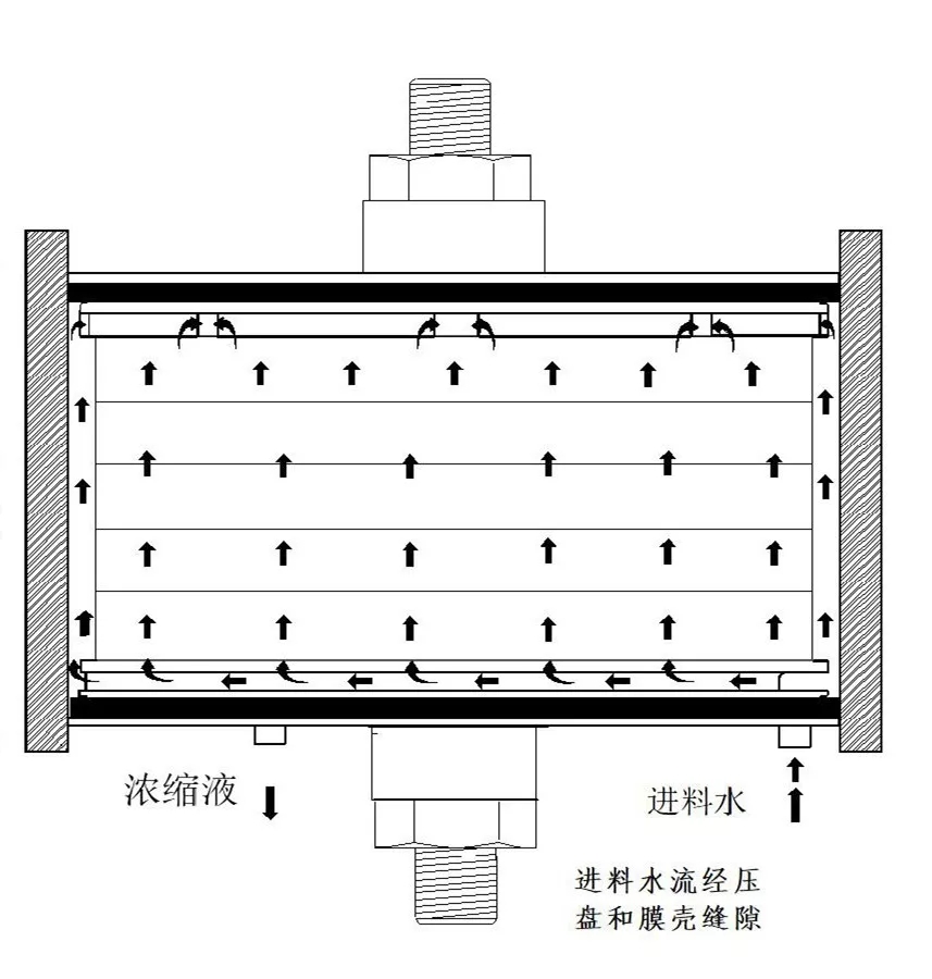 上圖放大部分顯示瞭(le)進料水流經薄膜墊片,純水透過液流經薄膜墊片並(bìng)被薄膜墊片中的絨頭織物片帶入透過液通道。液壓盤上的O型密封圈防止進料水進入透過液通道。